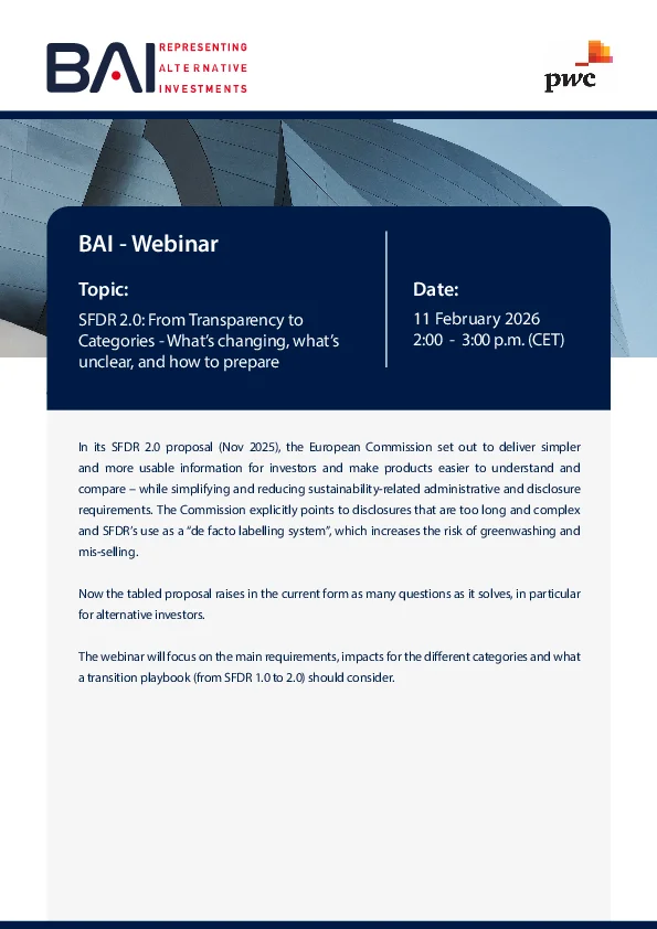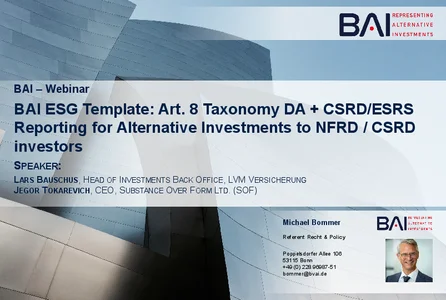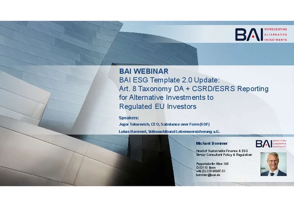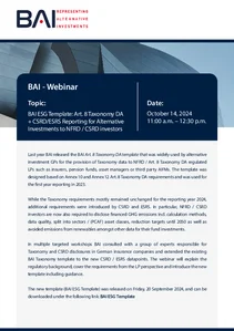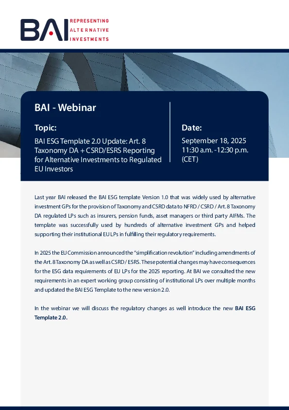 18 September 2025: BAI ESG Template 2.0 Update: Art. 8 Taxonomy DA + CSRD/ESRS Reporting for Alternative Investments to Regulated EU Investors