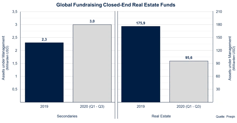 Die Erkenntnisse aus dem BAI Investor Survey spiegeln sich ebenfalls im Fundraising wider. Dem Datenprovider Preqin zufolge wurden im Jahr 2019, unabhängig vom Zugangsweg als auch der Strategie, 175,9 Milliarden USD durch geschlossene Private-Market-Immobilienfonds eingeworben. Dabei entfielen nur knapp 2,3 Milliarden USD auf Real Estate Secondary Funds. Alleine in den ersten drei Quartalen 2020 wurde dieser Wert deutlich übertroffen. Mehr als 3 Milliarden USD wurden von Secondary Funds eingeworben. Auch aufgrund der Pandemie konnten Secondary Fundraising-Aktivitäten ein deutliches Wachstum gegenüber dem Vorjahr verzeichnen. Im Gegensatz dazu warben im selben Zeitraum alle geschlossenen Private-Market-Immobilienfonds zusammen gerade einmal 54,3 % des Kapitals aus dem Vorjahr ein.