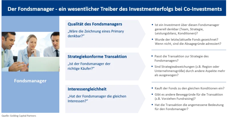 Für die Asset Manager bieten Co-investments verschiedenste Vorteile. Zum einen können sie Transaktionen tätigen, die sie aufgrund von Restriktionen – Limits bezüglich Transaktionsgrößen, regionale Allokationsgrenzen und mehr – sonst nicht allein tätigen könnten. Zum anderen lässt sich – besonders großen – Investoren ein zusätzlicher Investitionsanreiz bieten. Somit wird die Beziehung zwischen Investor und Asset Manager bei – erfolgreichen – Co-Investments deutlich gestärkt.