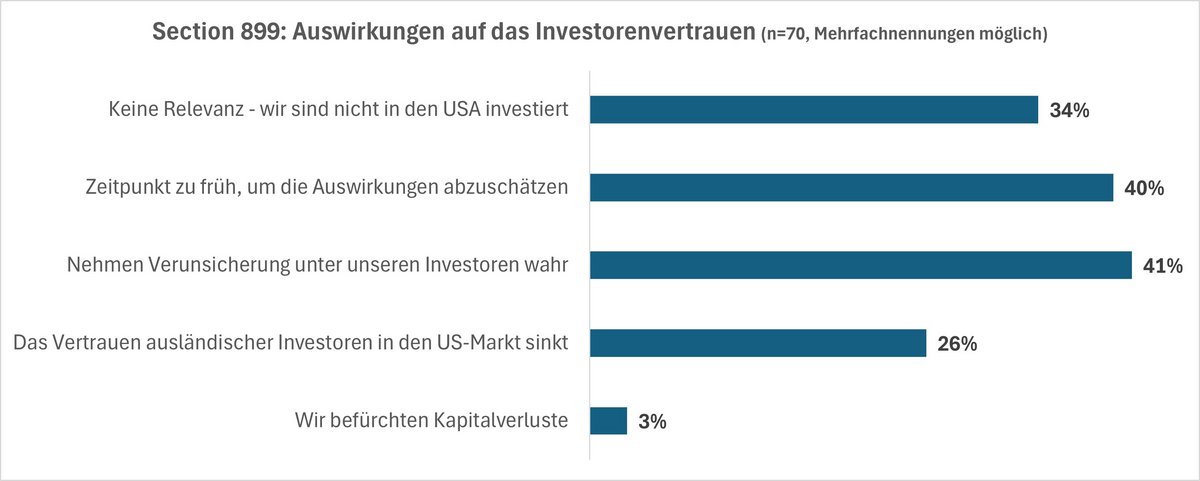 „Section 899“ wurde u.a. nach einer Vereinbarung der G7 zur Förderung koordinierter internationaler Steuerreformen innerhalb der OECD fallen gelassen. Die Streichung von „Section 899“ ist international als positives Signal gewertet worden, hätten die Regelungen doch erhebliche Auswirkungen auf ausländische Investoren und Unternehmen mit Verbindungen zu den USA haben können. Die BAI-Umfrage unter Asset Managern kam diesbezüglich zu einem zu frühen Zeitpunkt, um die endgültigen Gesetzesänderungen abschätzen zu können.