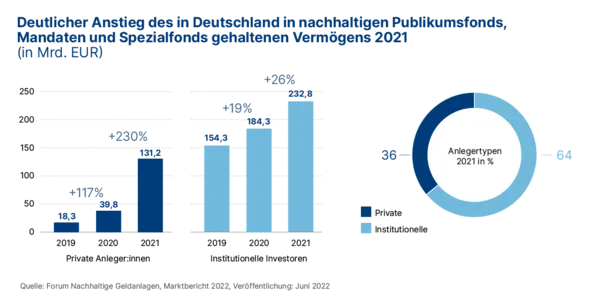 Die Zahlen des „Forum Nachhaltige Geldanlagen“ (FNG) machen unterdessen nochmals deutlich, dass ESG-konformes Investieren weiter im Aufwind ist. Gerade seitens institutioneller Investoren wächst der Bedarf. Hintergrund ist das zunehmende öffentliche Bewusstsein, dass etwa in Bezug auf die Klimawende gehandelt werden muss. Gleichzeitig tragen die mit großem politischen Druck vorangetriebenen regulatorischen Entwicklungen zum Auftrieb bei. Die Gesamtsumme verantwortlicher Investments erreichte laut FNG 2021 in Deutschland eine neue Rekordmarke von 2,2 Billionen Euro. 64 Prozent der in nachhaltigen Publikumsfonds, Mandaten und Spezialfonds gehaltenen Gelder kamen von institutionellen Investoren. Dabei dominierten ganz klar Fonds und Mandate mit Aktien, Anleihen und Immobilien, zu geringen Prozentsätzen wurde aber auch in nachhaltige Hedgefonds, Venture Capital/Direktbeteiligungen und Rohstoffe investiert.