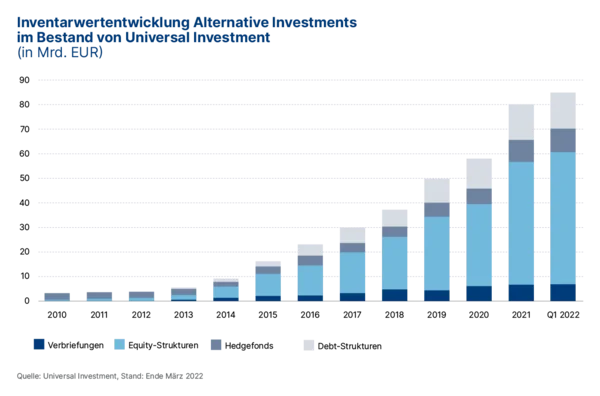 Zwar ist die Unsicherheit unter institutionellen Investoren und Fondsinitiatoren angesichts des Ukraine-Kriegs gestiegen, doch hat sich der positive Trend für Alternatives generell auch im laufenden Jahr fortgesetzt, wie die Zahlen von Universal Investment zeigen. Schon zwischen Ende 2020 und Ende 2021 war das Volumen der bei Universal Investment in Deutschland und Luxemburg aufgelegten Vehikel, die ausschließlich in Alternatives investieren, von knapp 57 Milliarden Euro auf fast 80 Milliarden gestiegen – ein Plus von 40 Prozent in nur einem Jahr. Ende März 2022 waren es dann bereits 84,5 Milliarden Euro, womit sich der kontinuierliche Anstieg fortsetzte. Angesichts der im Zuge der Zinswende wachsenden Kursrisiken in den klassischen Anleiheportfolios vieler Investoren dürfte die Nachfrage nach alternativen Anlagen weiterhin Unterstützung erfahren.