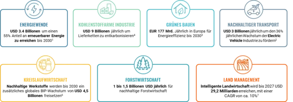 Alternatives können dabei im Rahmen von Investments eine besondere Rolle einnehmen, denn viele sind per se schon „grün“: Investitionen in Waldflächen, Projekte erneuerbarer Energien wie Wind- oder Fotovoltaikanlagen, Speichertechnologien, öffentlichen Nah- und Fernverkehr und Carbon-Capture-Projekte sind Beispiele für prominente Möglichkeiten nachhaltigen Investierens.