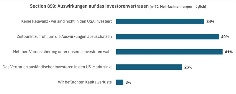 „Section 899“ wurde u.a. nach einer Vereinbarung der G7 zur Förderung koordinierter internationaler Steuerreformen innerhalb der OECD fallen gelassen. Die Streichung von „Section 899“ ist international als positives Signal gewertet worden, hätten die Regelungen doch erhebliche Auswirkungen auf ausländische Investoren und Unternehmen mit Verbindungen zu den USA haben können. Die BAI-Umfrage unter Asset Managern kam diesbezüglich zu einem zu frühen Zeitpunkt, um die endgültigen Gesetzesänderungen abschätzen zu können.