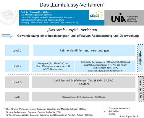 - Stufe 2: Die technischen Einzelheiten werden in Form von Durchführungsrichtlinien und -verordnungen in sog. Komitologieausschüssen (Experten aus der EU-Kommission und den Mitgliedstaaten) festgelegt.