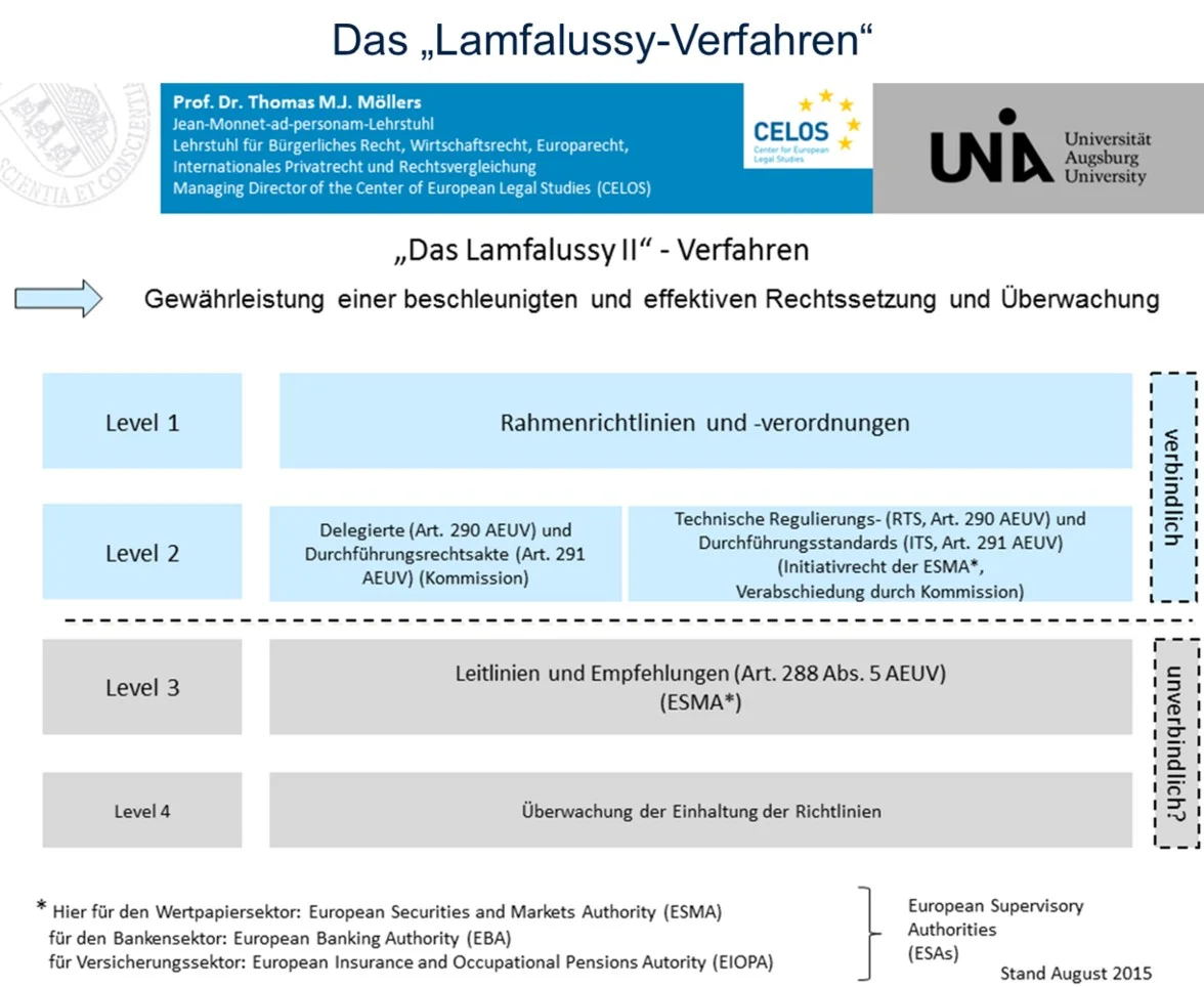 EU-Gesetzgebung im Bereich der Finanz- und Wertpapiermarktrechtsetzung, also auch im Investmentrecht, geschieht im sogenannten Lamfalussy-Verfahren, benannt nach Alexandre Lamfalussy, und soll die Gesetzgebung erleichtern und beschleunigen. Das Verfahren hat 4 Stufen: